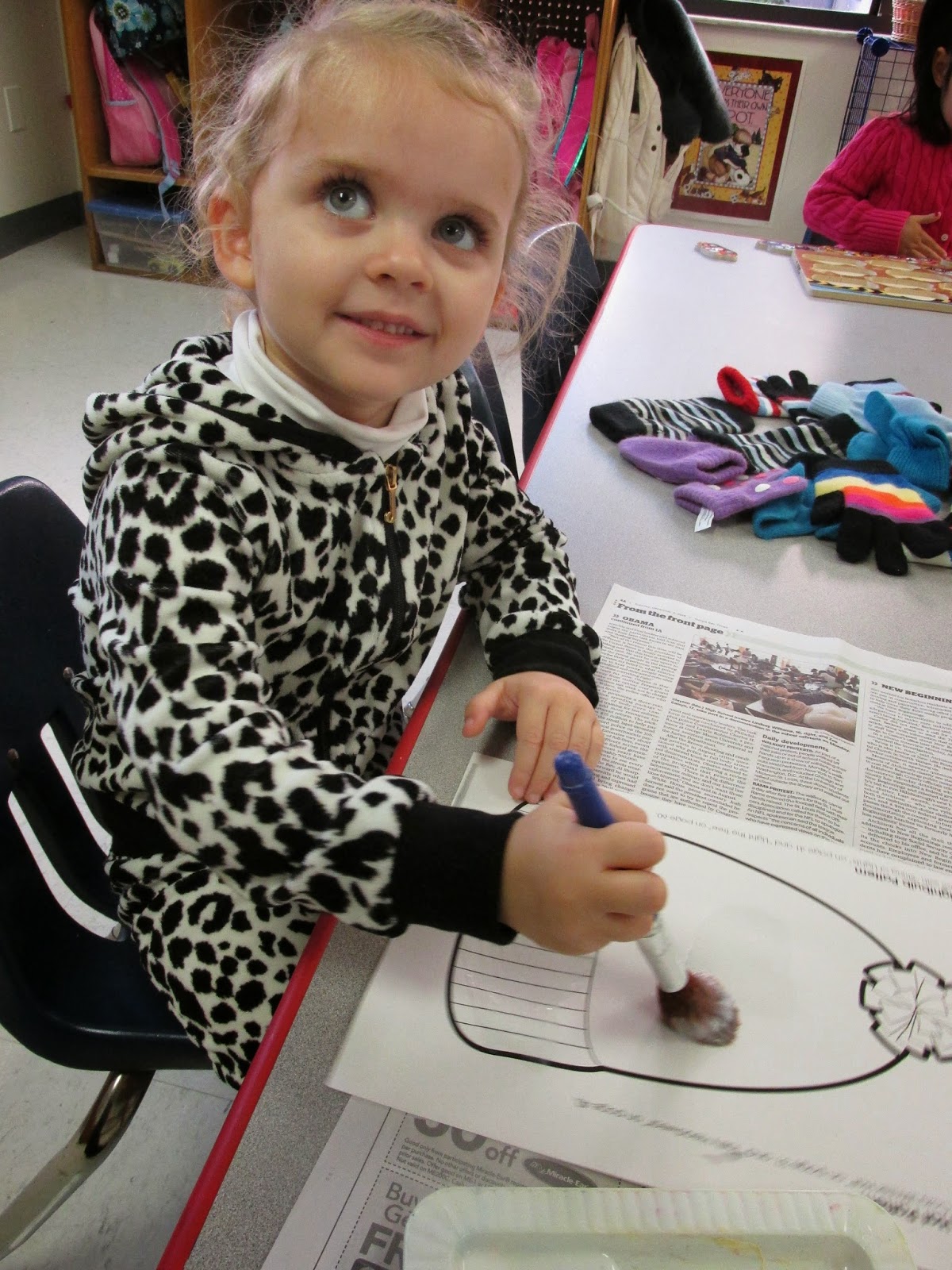 This snowflake project was a great exercise in fine motor skills, particularly in getting the hands ready to hold a pencil! The children also had to learn to control the "pipette" in order to get the paint into their pipette and then to release the paint. It took a few tries but they got the hang of it!